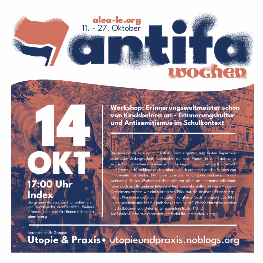 Die Gruppe utopie&praxis lädt am 14. Oktober um 17:00 Uhr zu einem Workshop, der das Thema der Auseinandersetzung mit Antisemitismus in der Bildungsarbeit in den Blick nimmt.